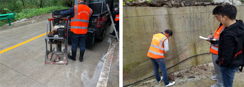2、路面工程:路面厚度采用鉆孔取芯機取樣鋼直尺量測,平整度用三米直尺按車道連續(xù)檢測。