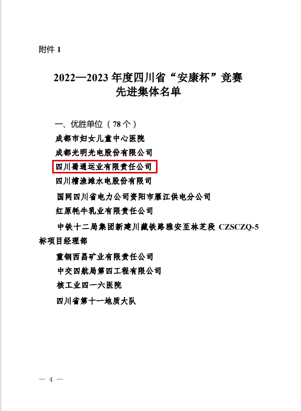 日前,省總工會(huì)、省應(yīng)急管理廳、省衛(wèi)健委聯(lián)合發(fā)文表揚(yáng)2022-2023年度四川省“安康杯”競賽先進(jìn)集體和先進(jìn)個(gè)人,蜀通公司被評(píng)為“優(yōu)勝單位”。