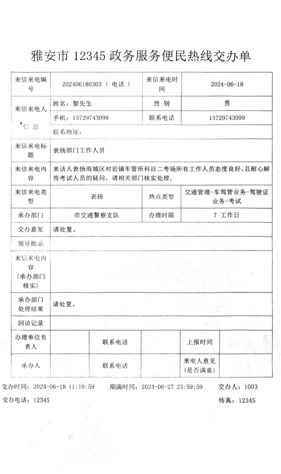 2024年6月18日,平順公司收到一封特殊的來信,市民黎先生通過“12345”政務(wù)服務(wù)便民熱線“...表揚(yáng)科目二考場所有工作人員態(tài)度良好,且耐心解答考試人員的疑問...”。字里行間表達(dá)了對我公司科目二所有工作人員工作的滿意和認(rèn)可。