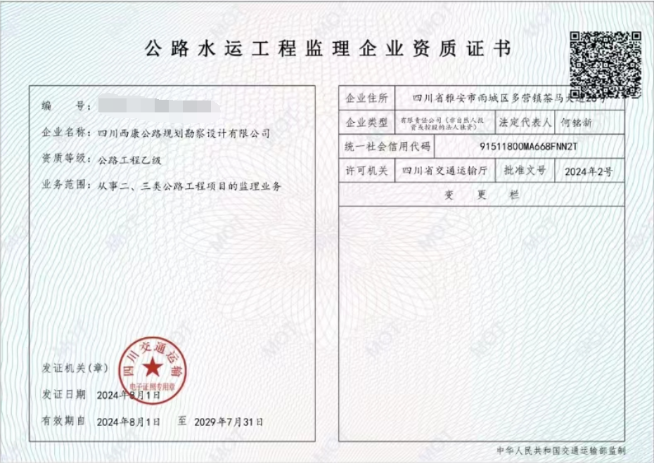 雅安交建集團(tuán)勘察設(shè)計(jì)公司喜獲公路工程監(jiān)理乙級(jí)資質(zhì)