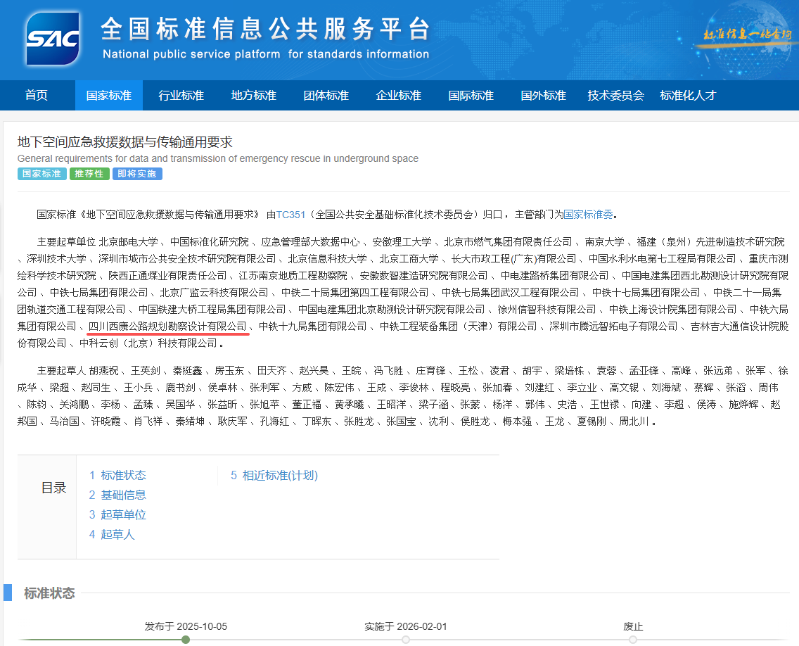 四川西康公路規(guī)劃勘察設(shè)計(jì)有限公司參與編制的國家標(biāo)準(zhǔn)《地下空間應(yīng)急救援?dāng)?shù)據(jù)與傳輸通用要求》正式發(fā)布