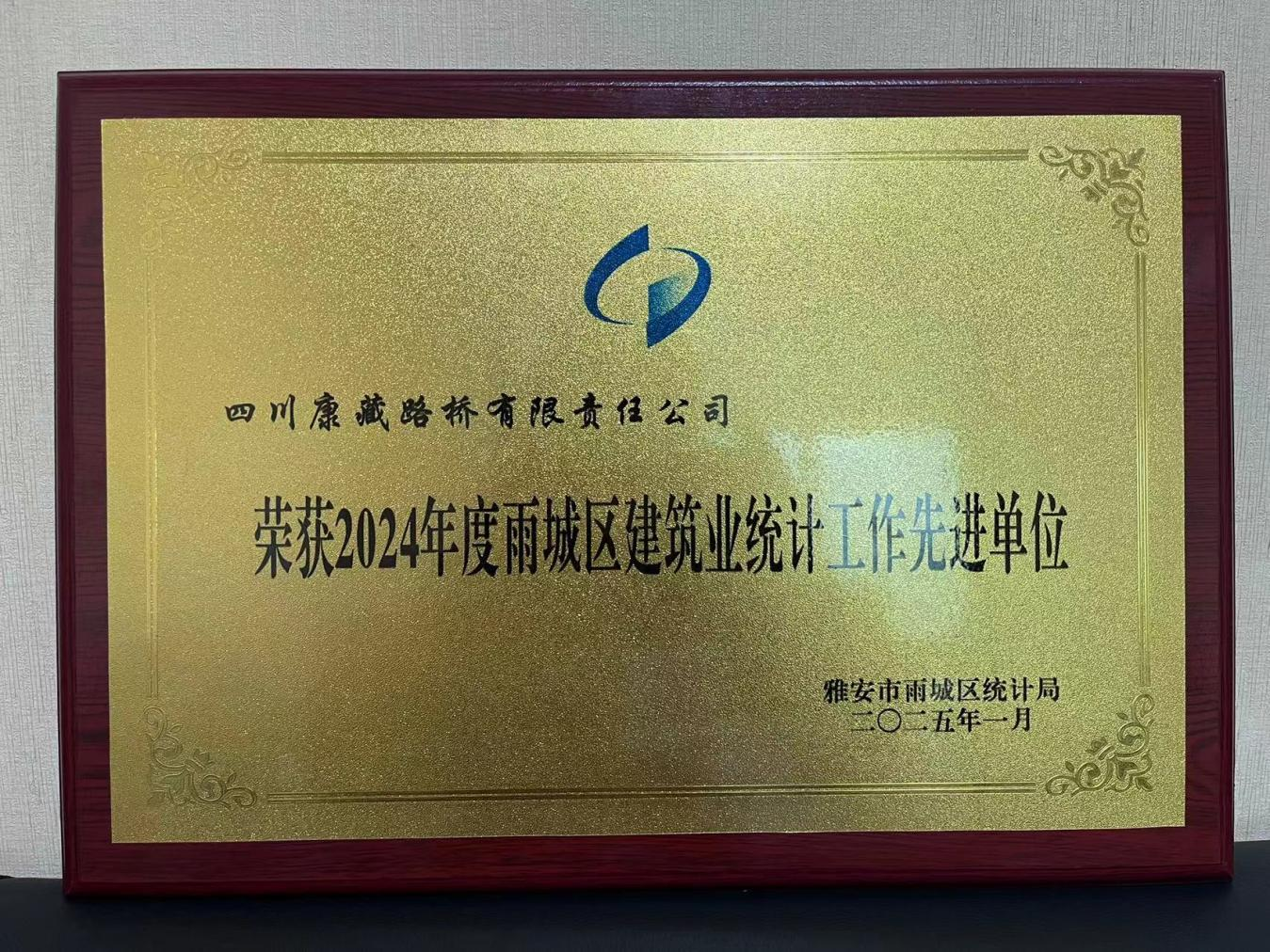 2025年1月,雅安市雨城區(qū)統(tǒng)計局授予四川康藏路橋有限責任公司“2024年度雨城區(qū)建筑業(yè)統(tǒng)計工作先進單位”榮譽稱號。過去的一年,路橋公司積極配合統(tǒng)計工作,保障數(shù)據(jù)準確及時,為雨城區(qū)建筑業(yè)統(tǒng)計工作的順利開展提供堅實的數(shù)據(jù)支撐。