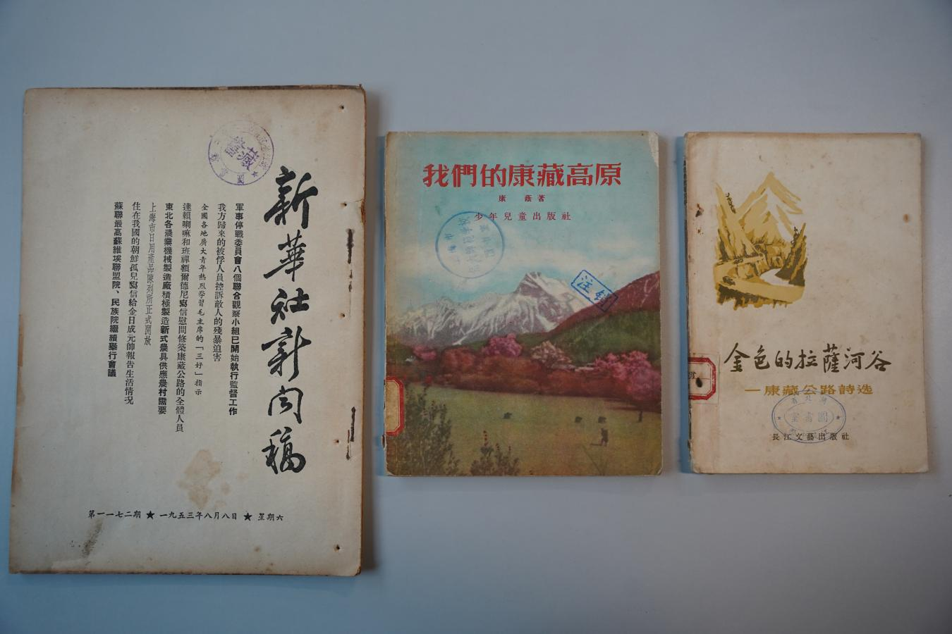 此次獲贈文獻(xiàn)具有重要?dú)v史價值,《金色的拉薩河谷(康藏公路詩選)》以詩歌形式記錄了康藏公路(今川藏公路)建設(shè)者的奮斗歷程,其中的不少詩篇被作曲家譜寫成歌曲;《我們的康藏高原》著重描寫了康藏公路的修筑歷程,講述了筑路英雄們的事跡及西藏和平解放后的新面貌;1953年8月8日發(fā)表的新華社新聞稿原件,以第一手資料還原了康藏公路修建期間的重要?dú)v史節(jié)點(diǎn)。