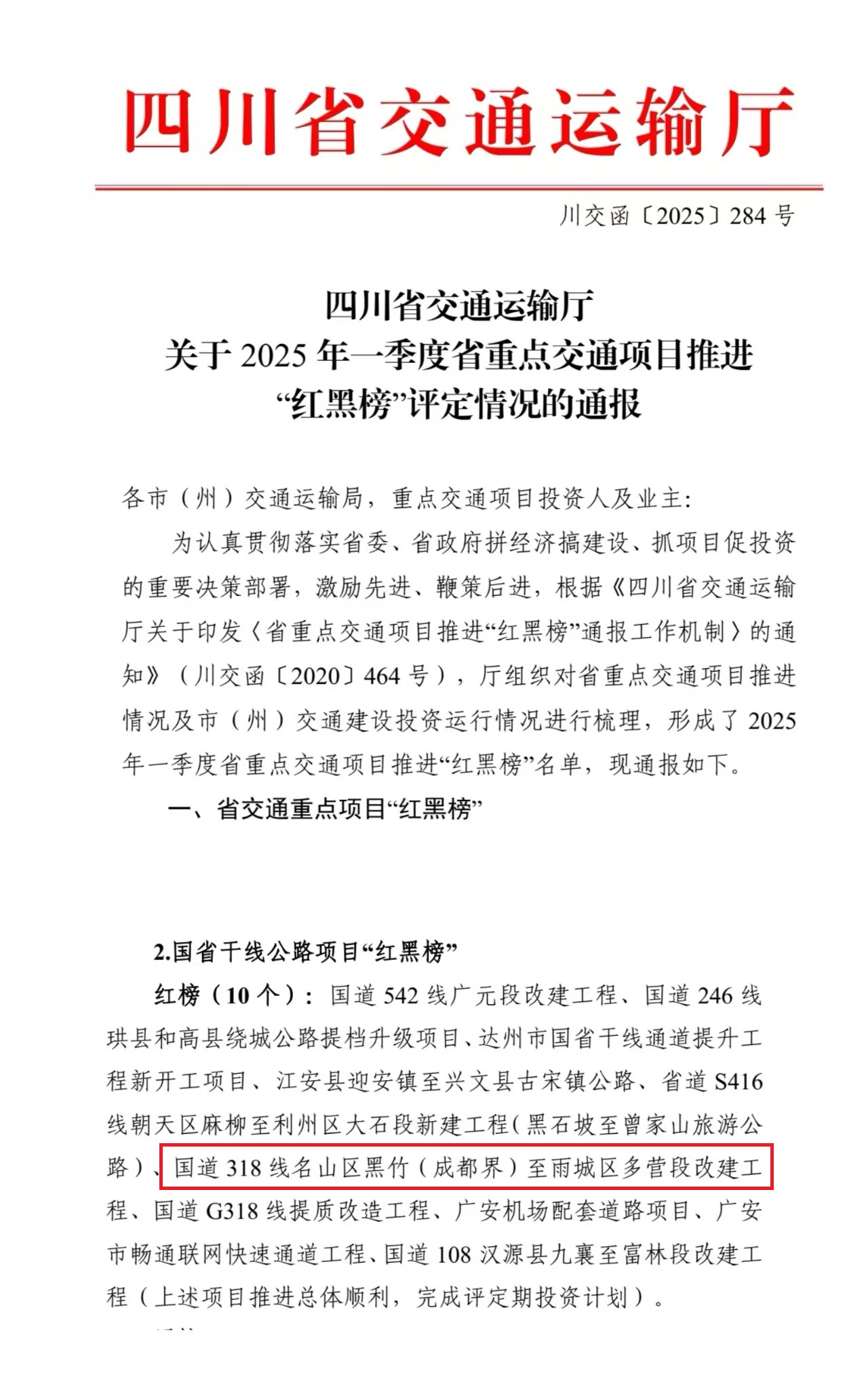近日,四川省交通運(yùn)輸廳發(fā)布2025年一季度省重點(diǎn)交通項(xiàng)目推進(jìn)“紅黑榜”評選結(jié)果,由雅安交建集團(tuán)四川康藏路橋有限責(zé)任公司承建的國道318線名山區(qū)黑竹(成都界)至雨城區(qū)多營段改建工程憑借超額完成投資計(jì)劃、關(guān)鍵節(jié)點(diǎn)取得突破等成效,成功入選國省干線公路項(xiàng)目“紅榜”。
