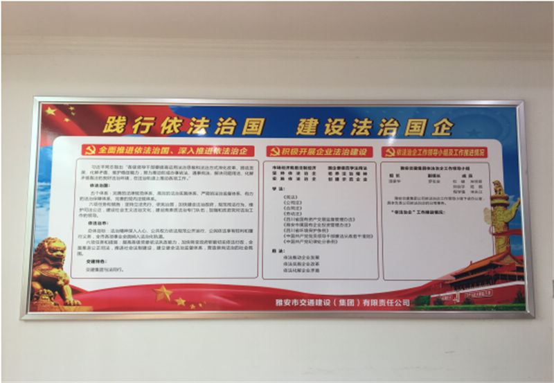三是印發(fā)《雅安市交通建設(集團)有限責任公司依法治企法律法規(guī)文件匯編》至公司領導班子成員與高管,作為會前學法材料與自學材料;制作依法治企宣傳展板,懸掛于公司內部進行法治宣傳工作。