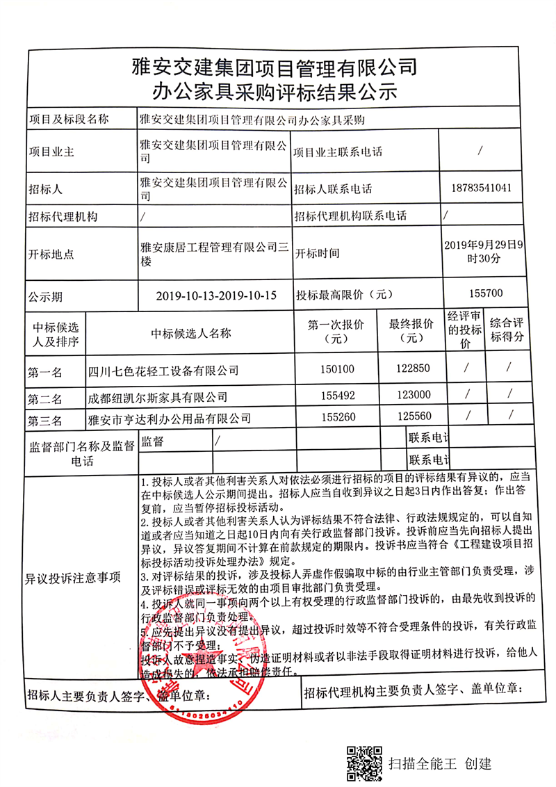 雅安交建集團(tuán)項(xiàng)目管理有限公司辦公家具采購評標(biāo)結(jié)果公示