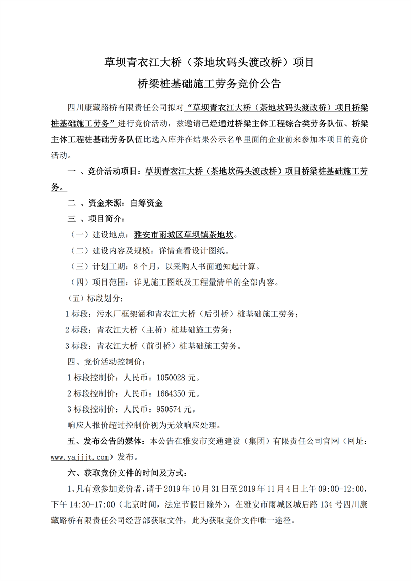 四川康藏路橋有限責(zé)任公司草壩青衣江大橋(茶地坎碼頭渡改橋)項(xiàng)目橋梁樁基礎(chǔ)施工勞務(wù)競價(jià)公告