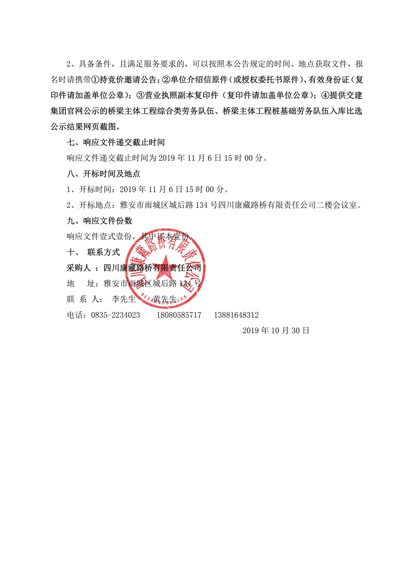 四川康藏路橋有限責(zé)任公司省道104線草壩至姚橋段改建工程項(xiàng)目橋梁樁基礎(chǔ)施工勞務(wù)競價(jià)公告