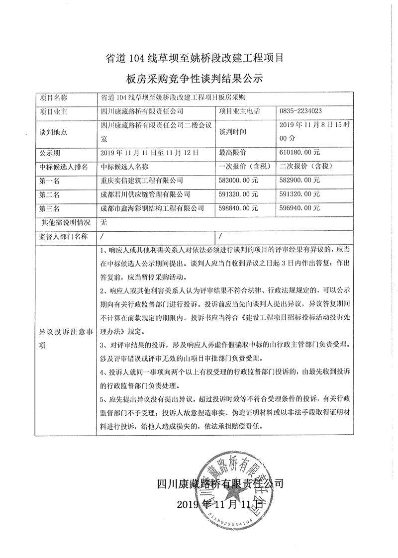 四川康藏路橋有限責(zé)任公司省道104線草壩至姚橋段改建工程項(xiàng)目板房采購競(jìng)爭(zhēng)性談判結(jié)果公示