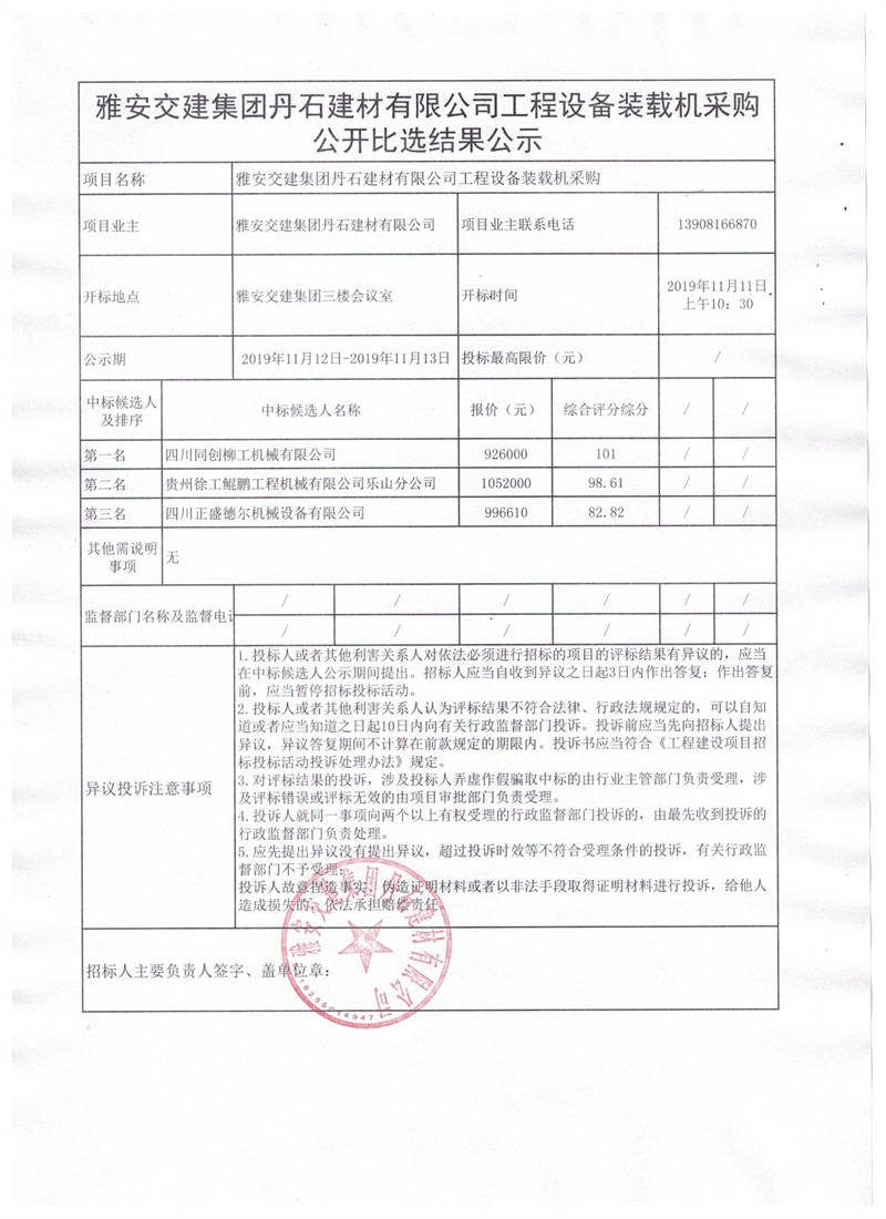 雅安交建集團丹石建材有限公司工程設(shè)備裝載機采購公開比選結(jié)果公示