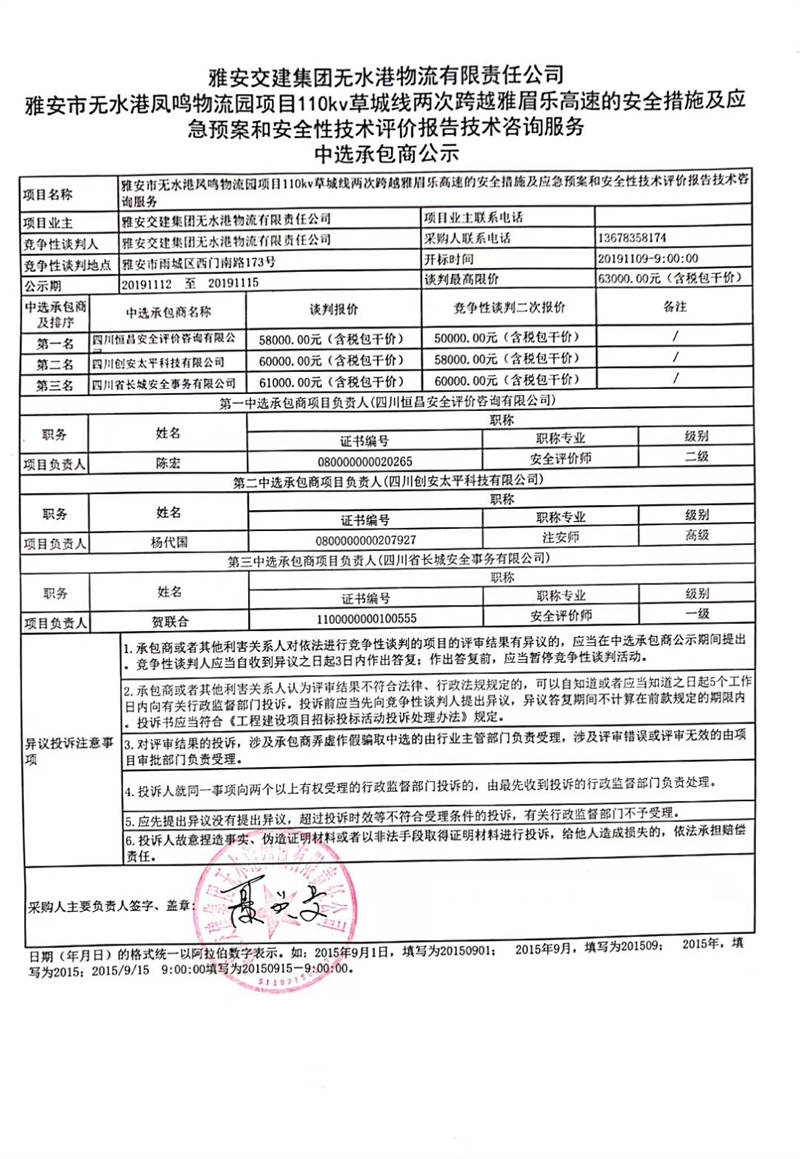 雅安交建集團無水港物流有限責任公司雅安市無水港鳳鳴物流園項目110kv草城線兩次跨越雅眉樂高速的安全措施、應(yīng)急預案以及安全性技術(shù)評價報告技術(shù)咨詢服務(wù)中選承包商公示