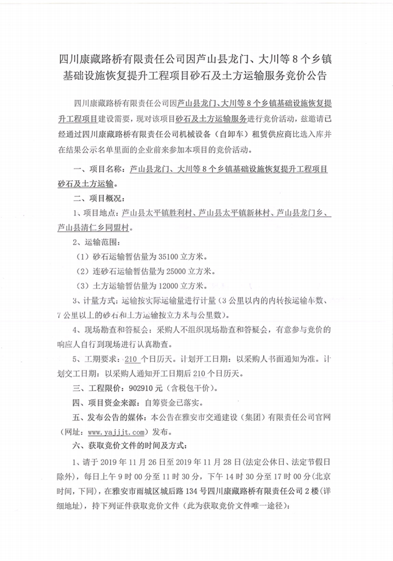 四川康藏路橋有限責任公司蘆山縣龍門、大川等8個鄉(xiāng)鎮(zhèn)基礎(chǔ)設(shè)施恢復提升工程項目砂石及土方運輸服務(wù)競價公告