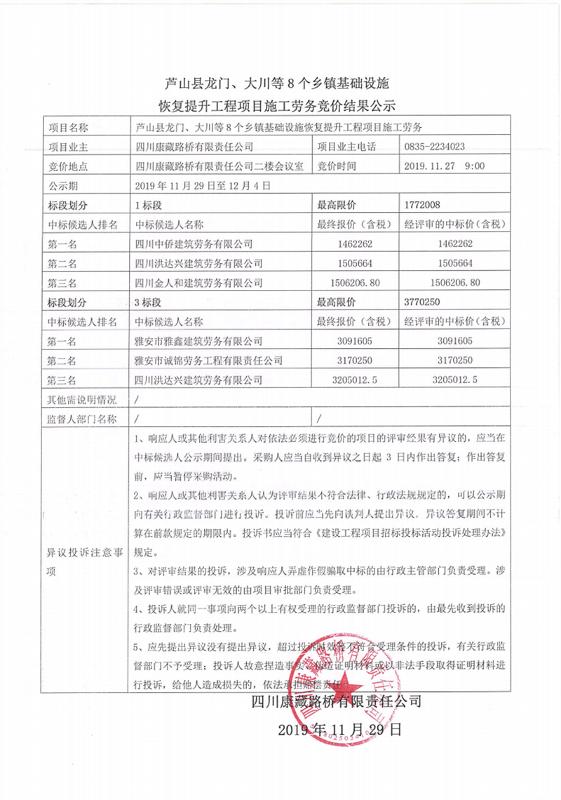 四川康藏路橋有限責(zé)任公司蘆山縣龍門、大川等8個鄉(xiāng)鎮(zhèn)基礎(chǔ)設(shè)施恢復(fù)提升工程項目施工勞務(wù)競價結(jié)果公示