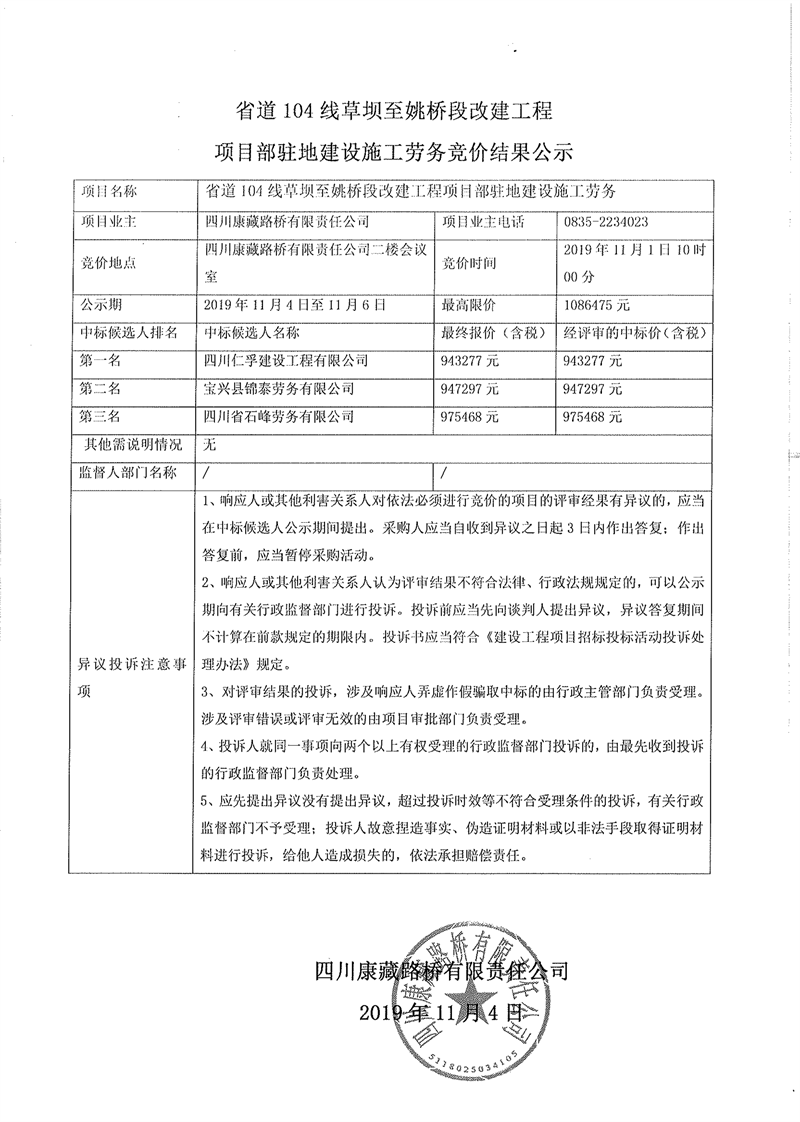 四川康藏路橋有限責(zé)任公司省道104線(xiàn)草壩至姚橋段改建工程項(xiàng)目部駐地建設(shè)施工勞務(wù)競(jìng)價(jià)結(jié)果公示
