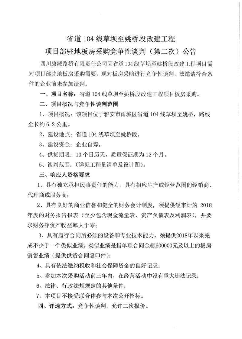四川康藏路橋有限責(zé)任公司省道104線草壩至姚橋段改建工程項(xiàng)目部駐地板房采購競(jìng)爭(zhēng)性談判(第二次)公告