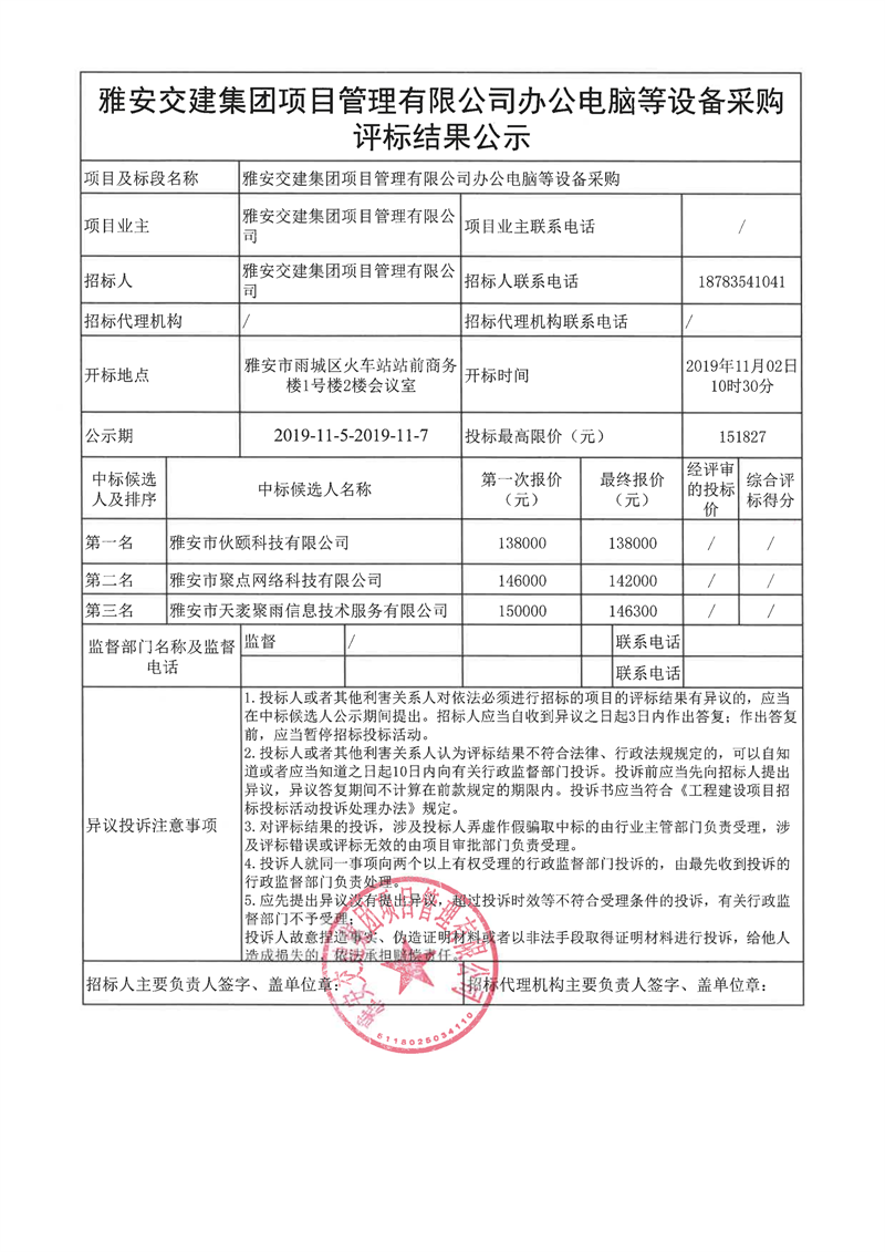 雅安交建集團(tuán)項(xiàng)目管理有限公司辦公電腦等設(shè)備采購(gòu)評(píng)標(biāo)結(jié)果公示