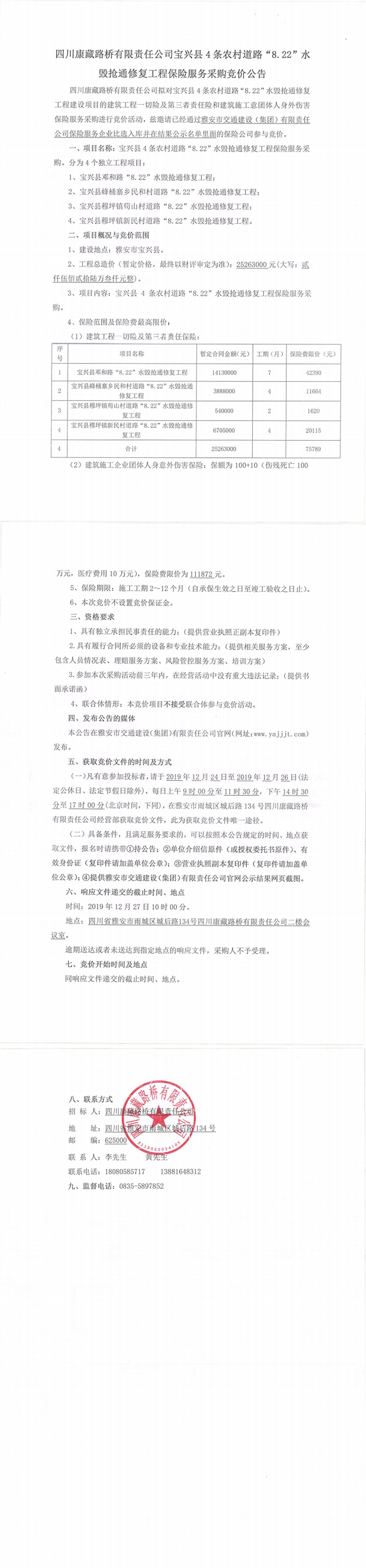 四川康藏路橋有限責(zé)任公司寶興縣4條農(nóng)村道路“8.22”水毀搶通修復(fù)工程保險(xiǎn)服務(wù)采購競價(jià)公告