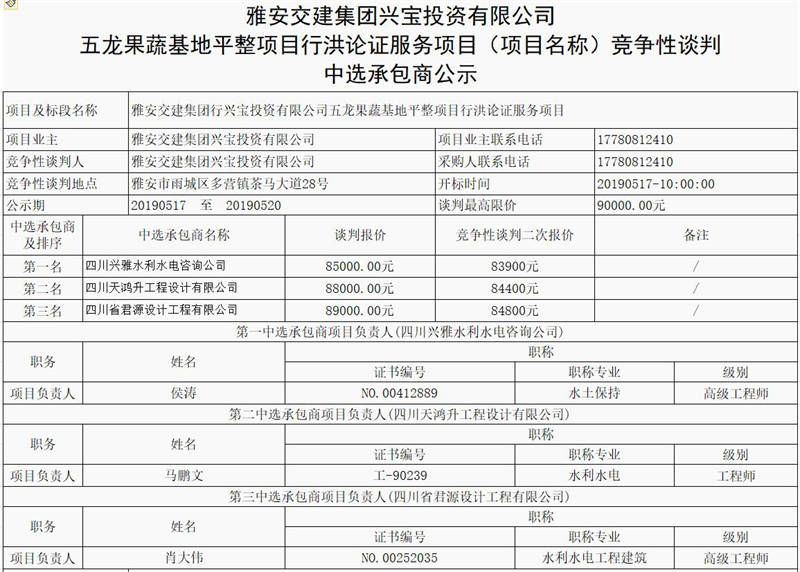 雅安交建集團(tuán)興寶投資有限公司五龍果蔬基地平整項目行洪論證服務(wù)項目(項目名稱)競爭性談判 中選承包商公示