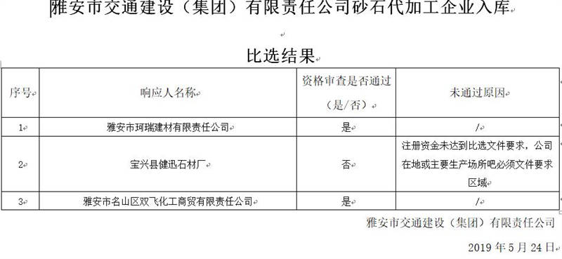 雅安市交通建設(shè)(集團(tuán))有限責(zé)任公司砂石代加工企業(yè)入庫比選結(jié)果公示