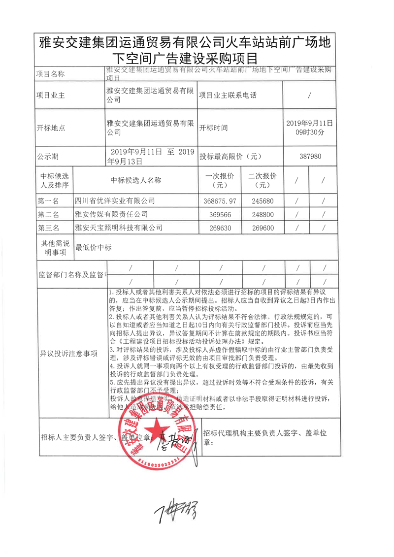 雅安交建集團運通貿(mào)易有限公司火車站站前廣場地下空間廣告建設(shè)采購項目結(jié)果公示