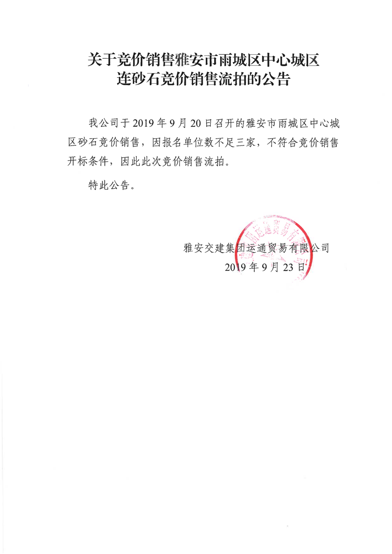 雅安交建集團(tuán)運(yùn)通貿(mào)易有限公司關(guān)于競(jìng)價(jià)銷(xiāo)售雅安市雨城區(qū)中心城區(qū)連砂石競(jìng)價(jià)銷(xiāo)售流拍的公告