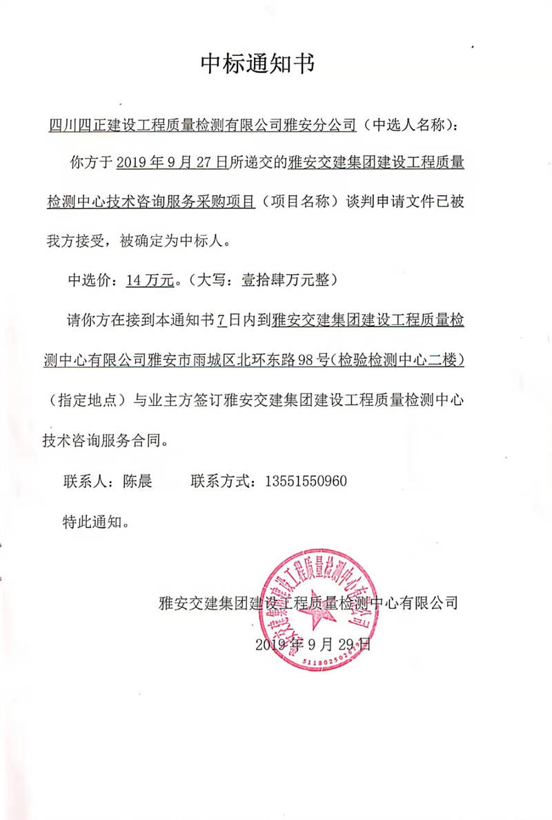 雅安交建集團建設工程質(zhì)量檢測中心技術(shù)咨詢服務采購項目中標公示
