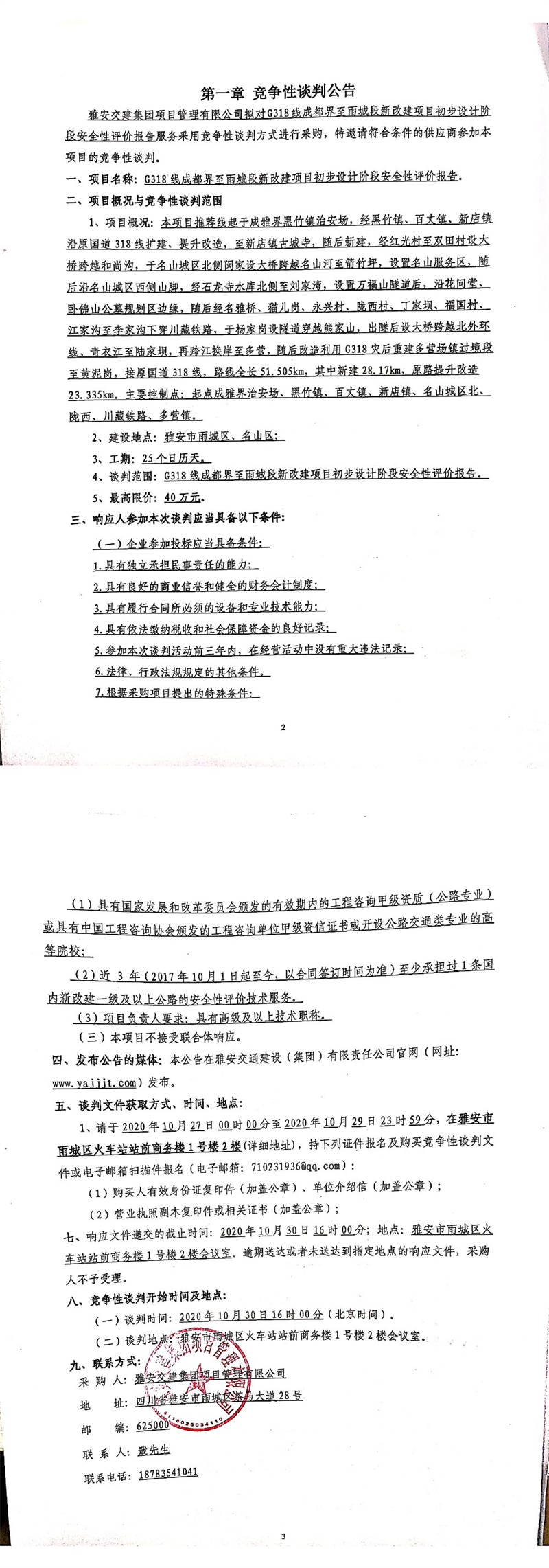 雅安交建集團(tuán)項(xiàng)目管理有限公司G318線成都界至雨城段新改建項(xiàng)目初步設(shè)計(jì)階段安全性評價報(bào)告競爭性談判公告