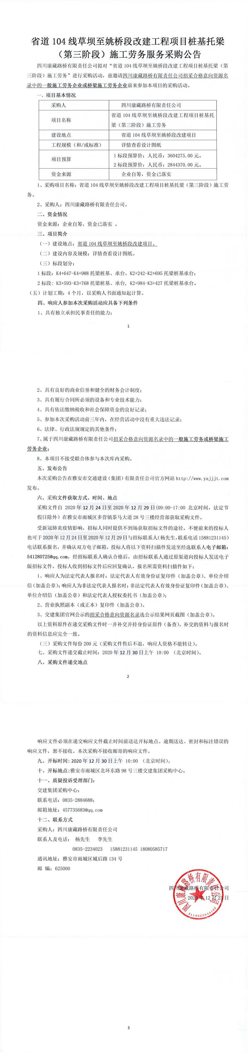 四川康藏路橋有限責任公司省道104線草壩至姚橋段改建工程項目樁基托梁(第三階段)施工勞務(wù)服務(wù)采購公告
