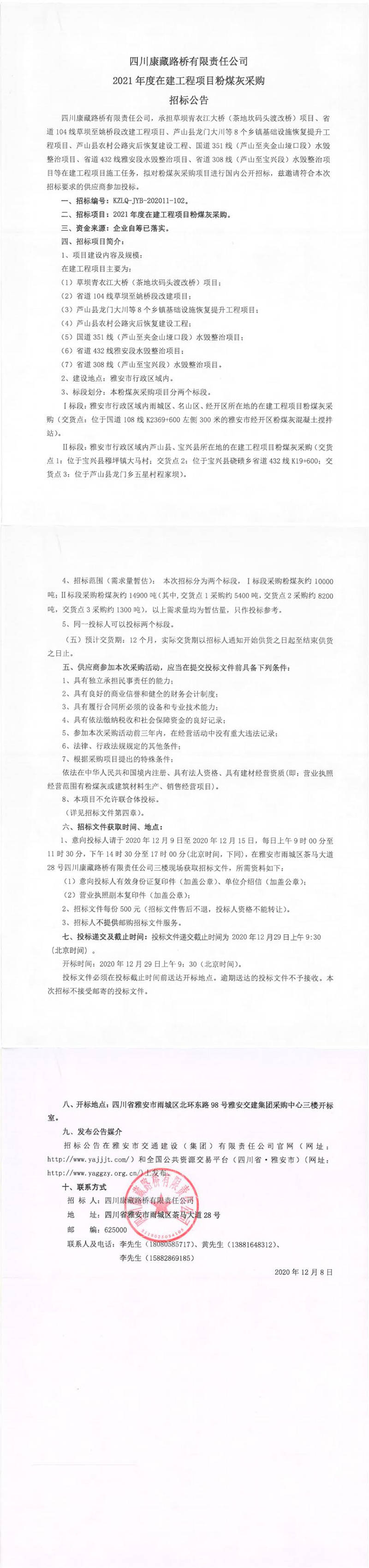四川康藏路橋有限責(zé)任公司2021年度在建工程項目粉煤灰采購招標公告