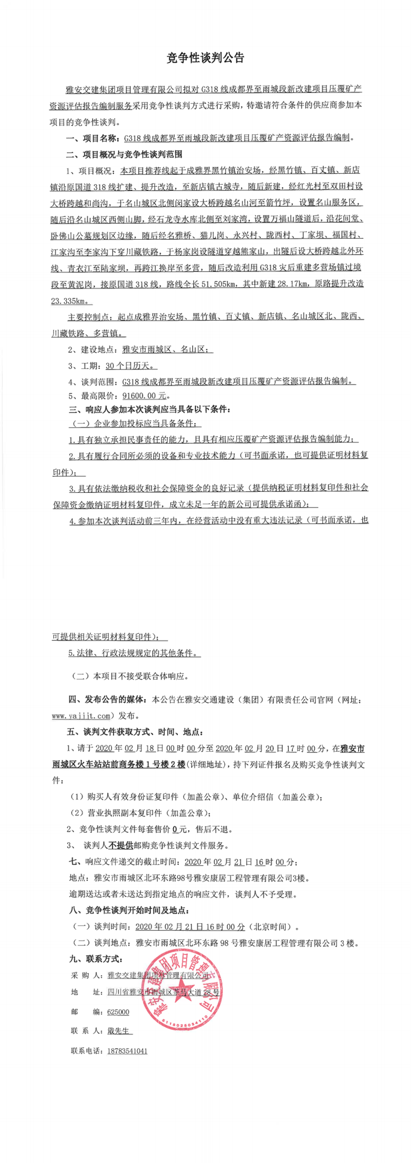 雅安交建集團(tuán)項(xiàng)目管理有限公司G318線成都界至雨城段新改建項(xiàng)目壓覆礦產(chǎn)資源評(píng)估報(bào)告編制競(jìng)爭(zhēng)性談判公告