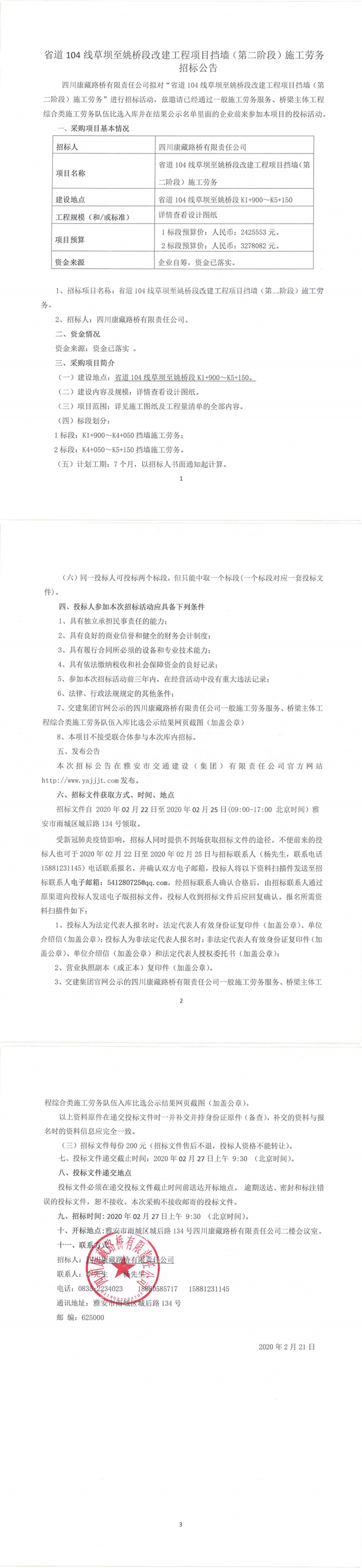 四川康藏路橋有限責(zé)任公司省道104線草壩至姚橋段改建工程項目擋墻(第二階段)施工勞務(wù)招標(biāo)公告