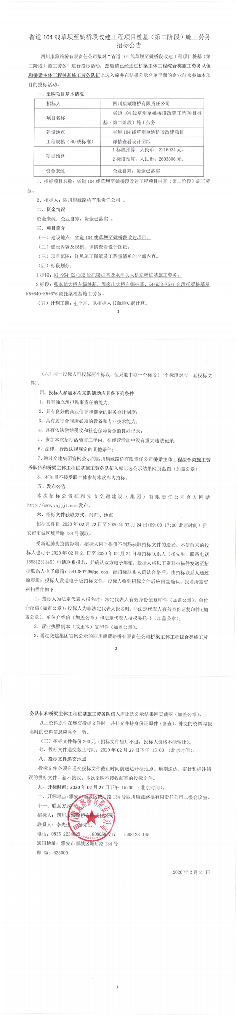 四川康藏路橋有限責(zé)任公司省道104線草壩至姚橋段改建工程項(xiàng)目樁基(第二階段)施工勞務(wù)招標(biāo)公告
