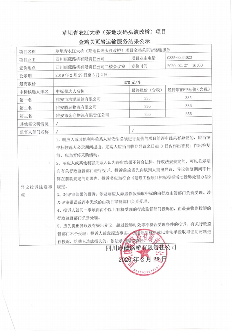四川康藏路橋有限責任公司草壩青衣江大橋(茶地坎碼頭渡改橋)項目金雞關(guān)頁巖運輸服務(wù)結(jié)果公示