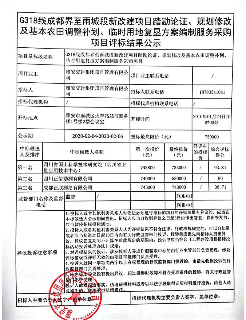 雅安交建集團項目管理有限公司G318線成都界至雨城段新改建項目踏勘論證、規(guī)劃修改及基本農(nóng)田調(diào)整補劃、臨時用地復墾方案編制服務采購項目評標結果公示