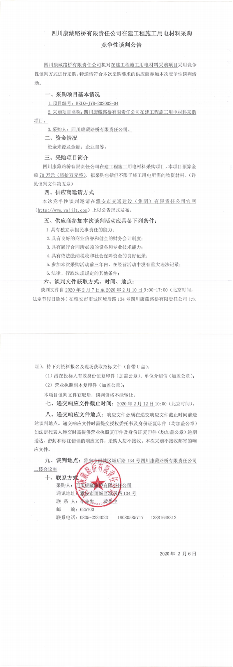 四川康藏路橋有限責任公司在建工程施工用電材料采購競爭性談判公告