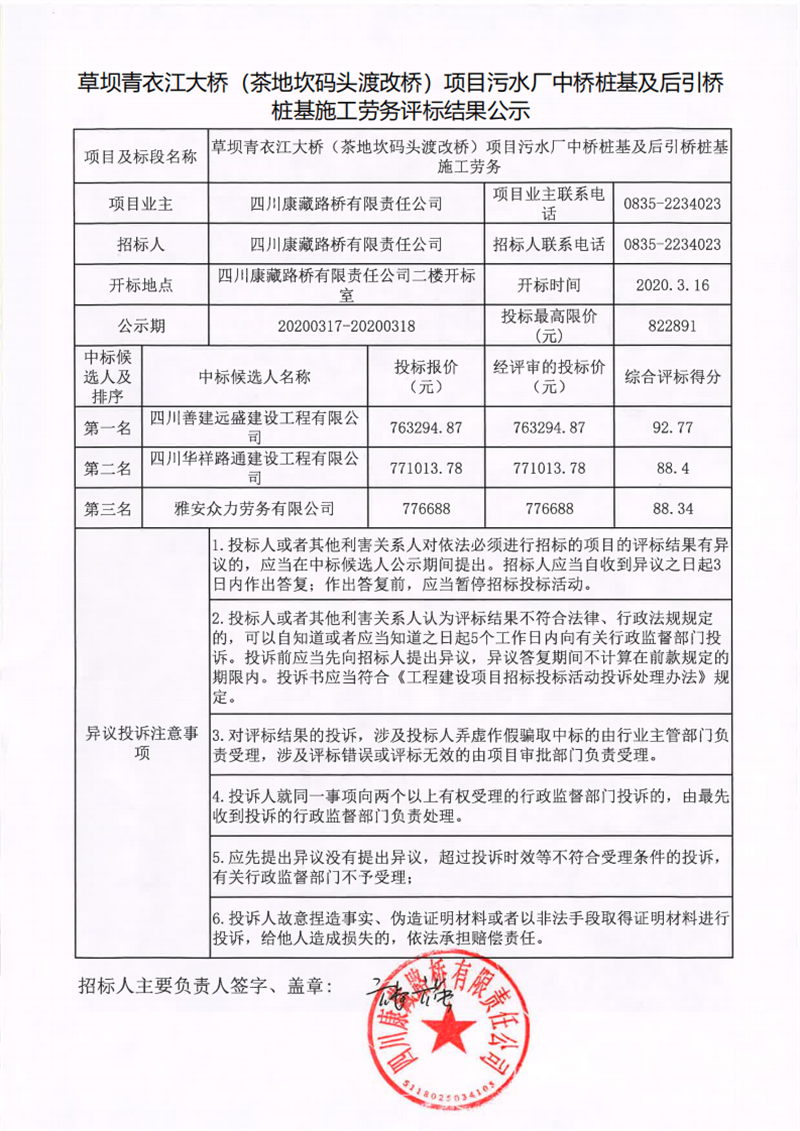 四川康藏路橋有限責任公司草壩青衣江大橋(茶地坎碼頭渡改橋)項目污水廠中橋樁基及后引橋樁基施工勞務評標結(jié)果公示