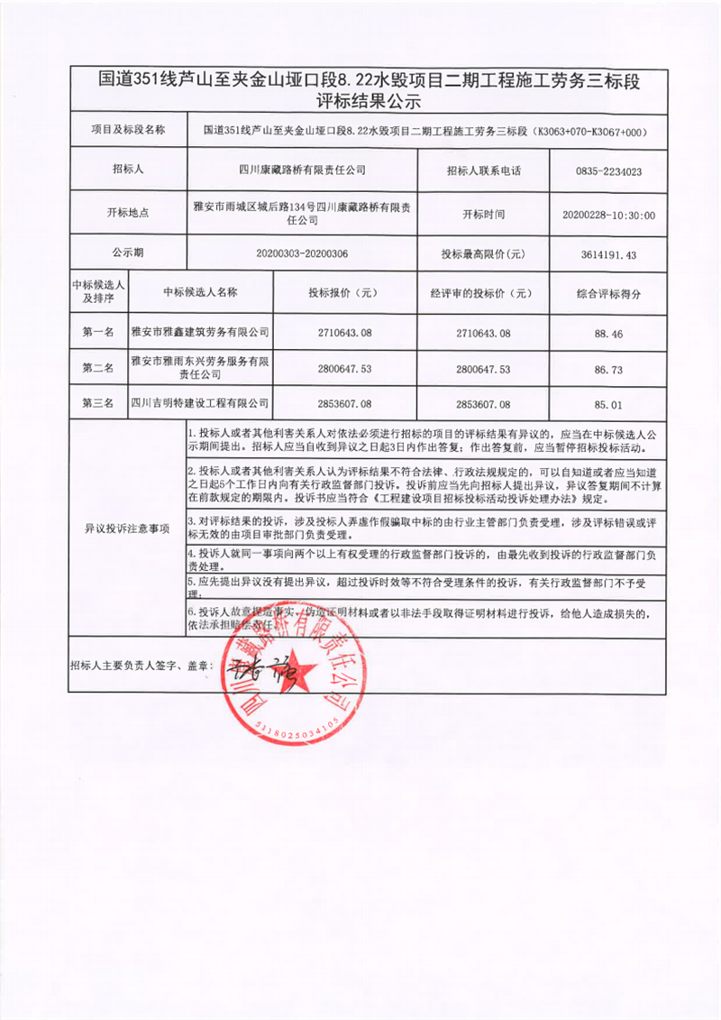四川康藏路橋有限責(zé)任公司國道351線蘆山至夾金山埡口段8.22水毀項(xiàng)目二期工程施工勞務(wù)三標(biāo)段評(píng)標(biāo)結(jié)果公示