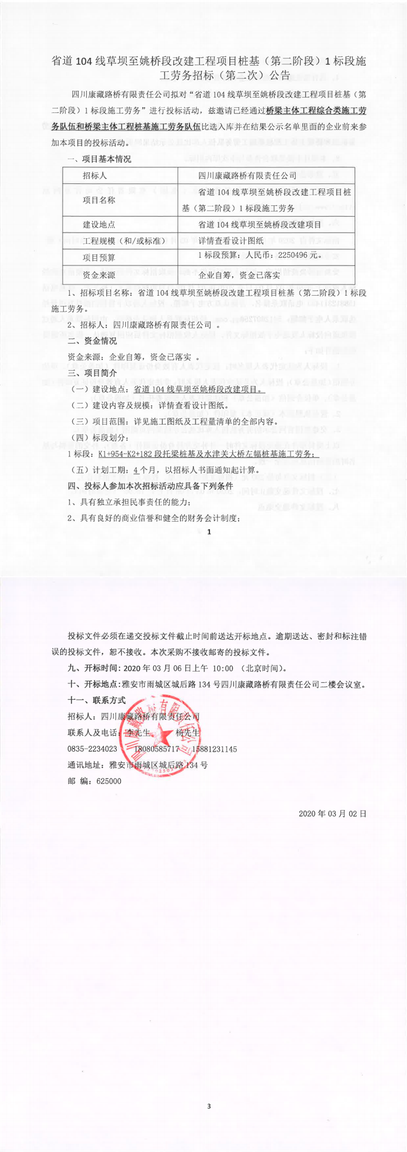 四川康藏路橋有限責任公司省道104線草壩至姚橋段改建工程項目樁基(第二階段)1標段施工勞務招標(第二次)公告