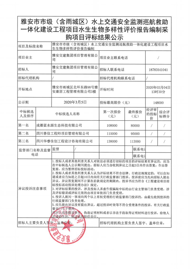 雅安交建集團(tuán)項(xiàng)目管理有限公司雅安市市級(含雨城區(qū))水上交通安全監(jiān)測巡航救助一體化建設(shè)工程項(xiàng)目水生生物多樣性評價(jià)報(bào)告編制采購項(xiàng)目評標(biāo)結(jié)果公示