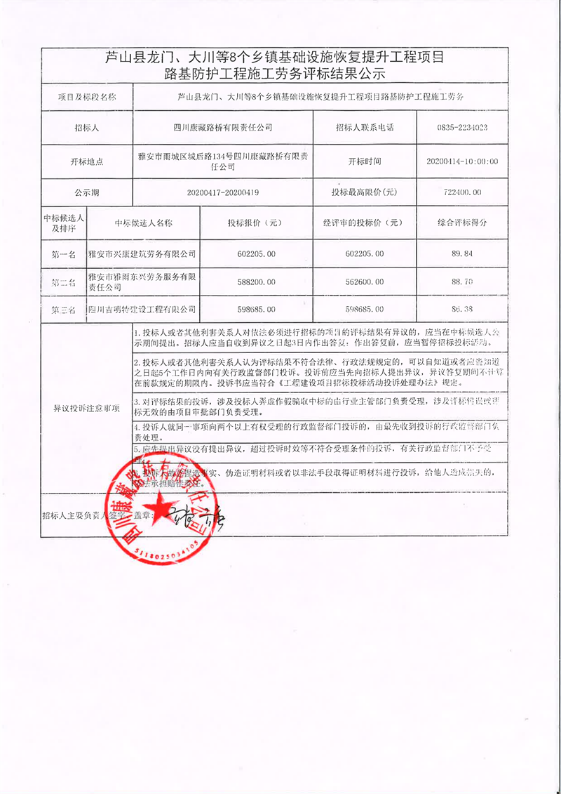 四川康藏路橋有限責任公司蘆山縣龍門、大川等8個鄉(xiāng)鎮(zhèn)基礎(chǔ)設(shè)施恢復(fù)提升工程項目路基防護工程施工勞務(wù)評標結(jié)果公示