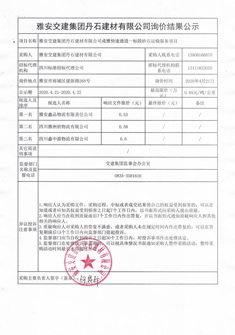 雅安交建集團(tuán)丹石建材有限公司成雅快速通道一標(biāo)段砂石運(yùn)輸服務(wù)項(xiàng)目詢價(jià)結(jié)果公示