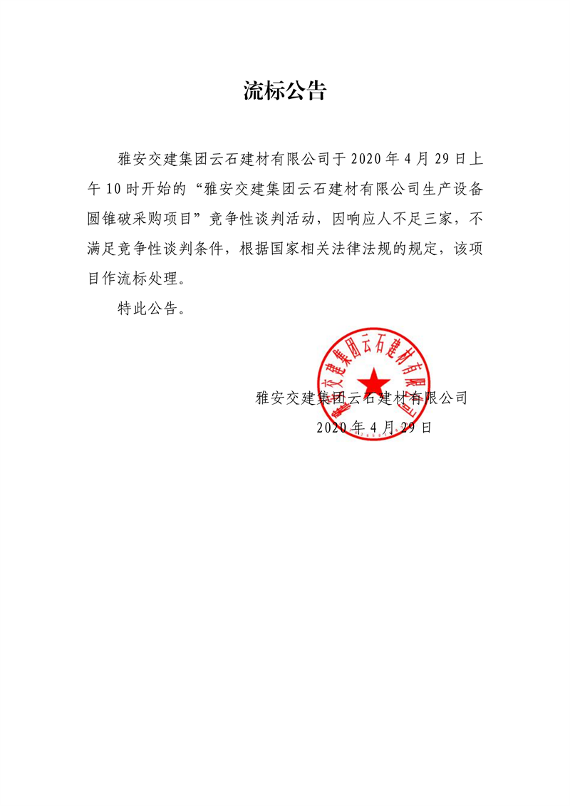 雅安交建集團(tuán)云石建材有限公司生產(chǎn)設(shè)備圓錐破采購項目流標(biāo)公告