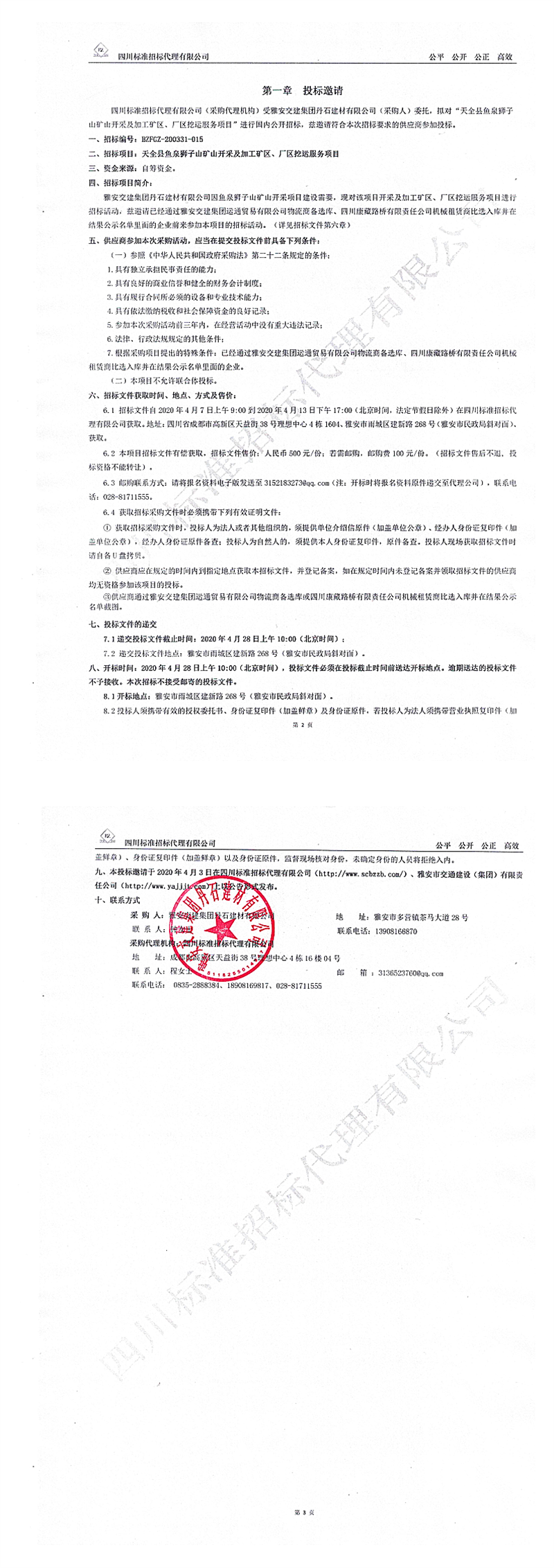 雅安交建集團丹石建材有限公司天全縣魚泉獅子山礦山開采及加工礦區(qū)、廠區(qū)挖運服務項目招標公告