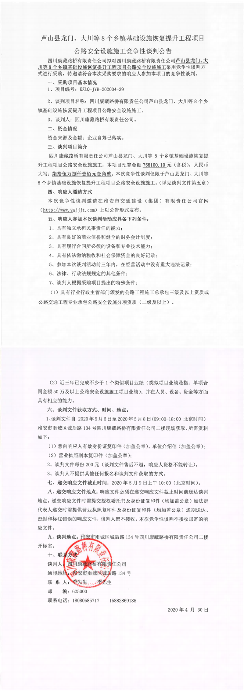 四川康藏路橋有限責(zé)任公司蘆山縣龍門、大川等8個鄉(xiāng)鎮(zhèn)基礎(chǔ)設(shè)施恢復(fù)提升工程項(xiàng)目公路安全設(shè)施施工競爭性談判公告