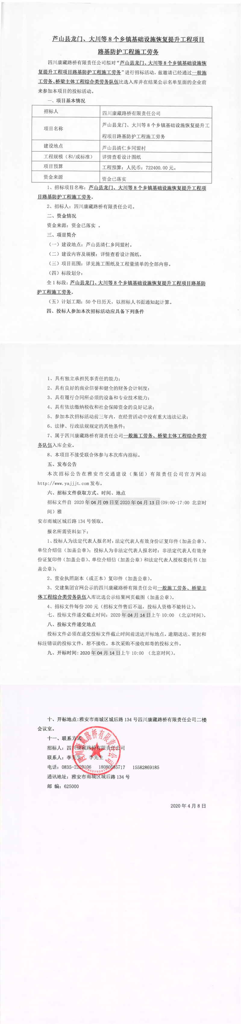 四川康藏路橋有限責(zé)任公司蘆山縣龍門(mén)、大川等8個(gè)鄉(xiāng)鎮(zhèn)基礎(chǔ)設(shè)施恢復(fù)提升工程項(xiàng)目路基防護(hù)工程施工勞務(wù)招標(biāo)公告