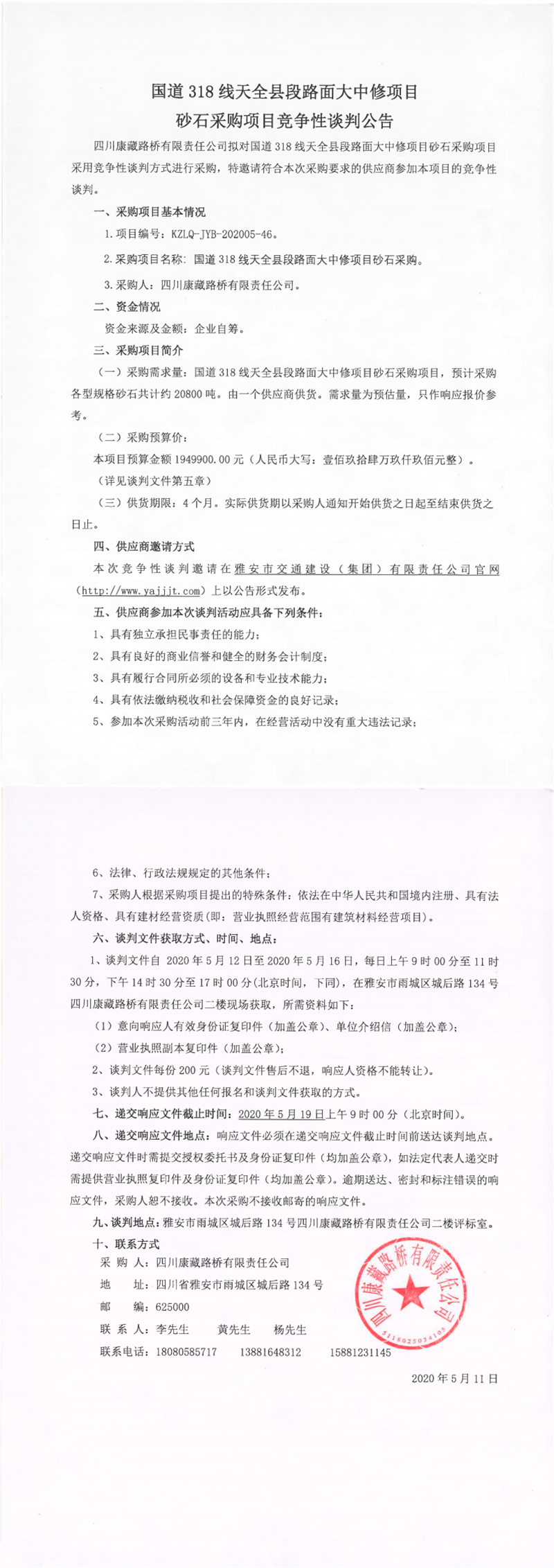 四川康藏路橋有限責(zé)任公司國(guó)道318線(xiàn)天全縣段路面大中修項(xiàng)目砂石采購(gòu)項(xiàng)目競(jìng)爭(zhēng)性談判公告