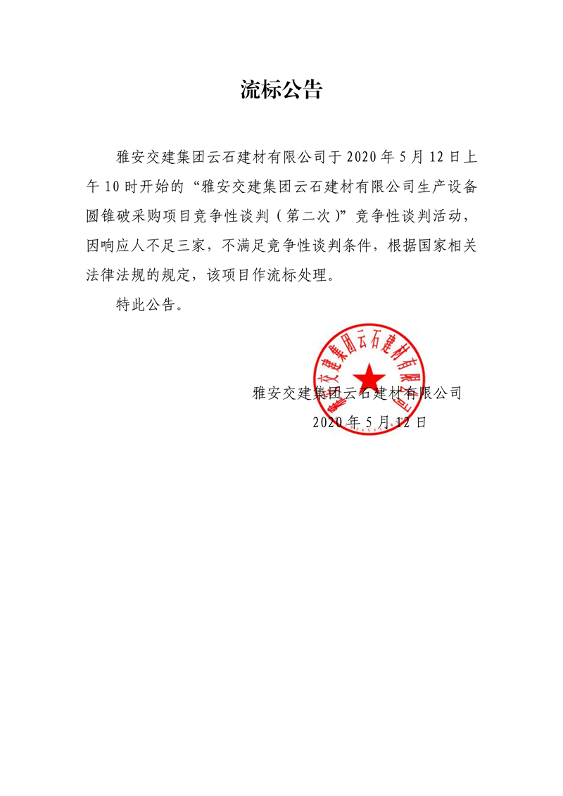 雅安交建集團云石建材有限公司生產(chǎn)設(shè)備圓錐破采購項目(第二次)流標(biāo)公告