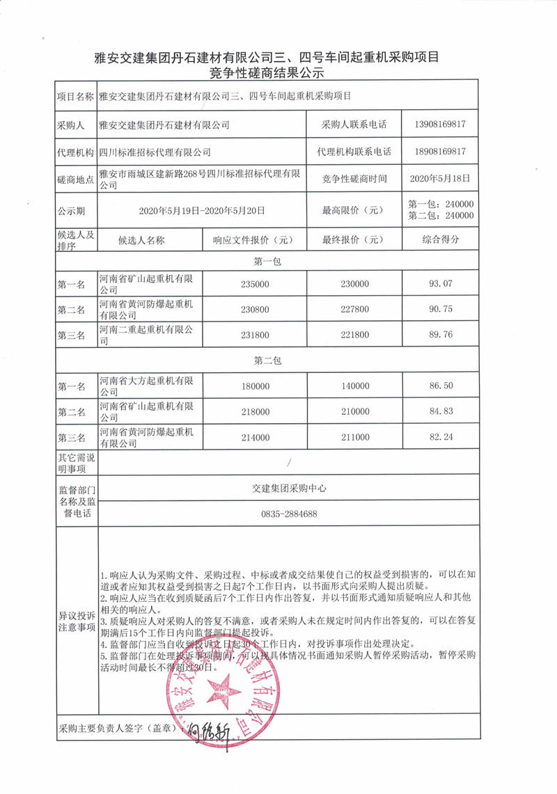 雅安交建集團(tuán)丹石建材有限公司三、四號車間起重機(jī)采購項目競爭性磋商結(jié)果公示