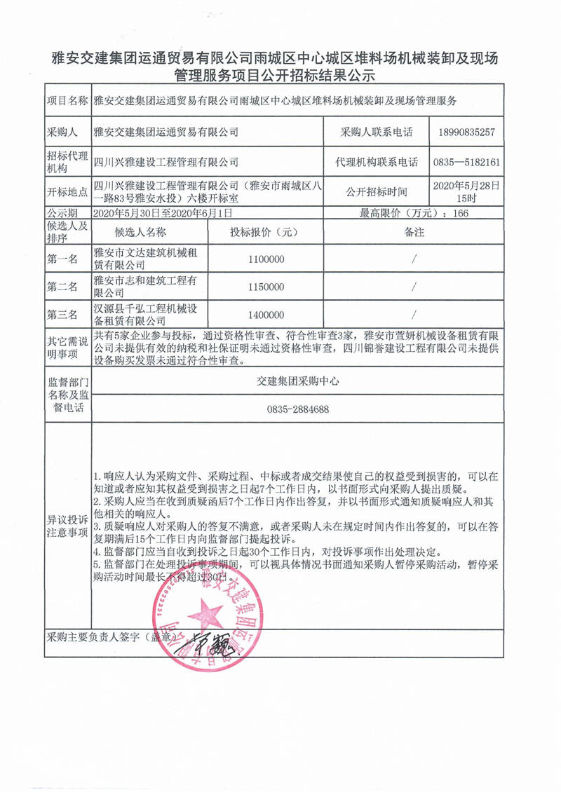 雅安交建集團運通貿易有限公司雨城區(qū)中心城區(qū)堆料場機械裝卸及現(xiàn)場管理服務項目公開招標結果公示