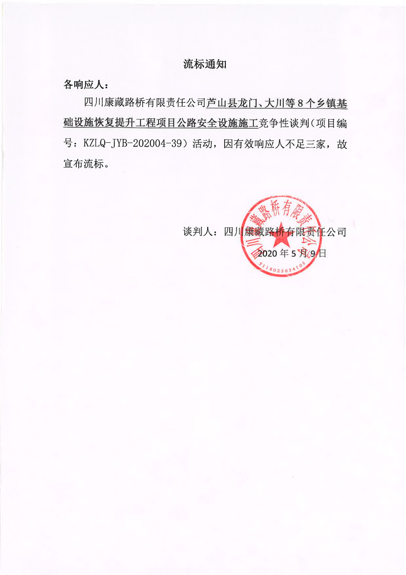 四川康藏路橋有限責(zé)任公司蘆山縣龍門、大川等8個鄉(xiāng)鎮(zhèn)基礎(chǔ)設(shè)施恢復(fù)提升工程項目公路安全設(shè)施施工競爭性談判流標(biāo)通知